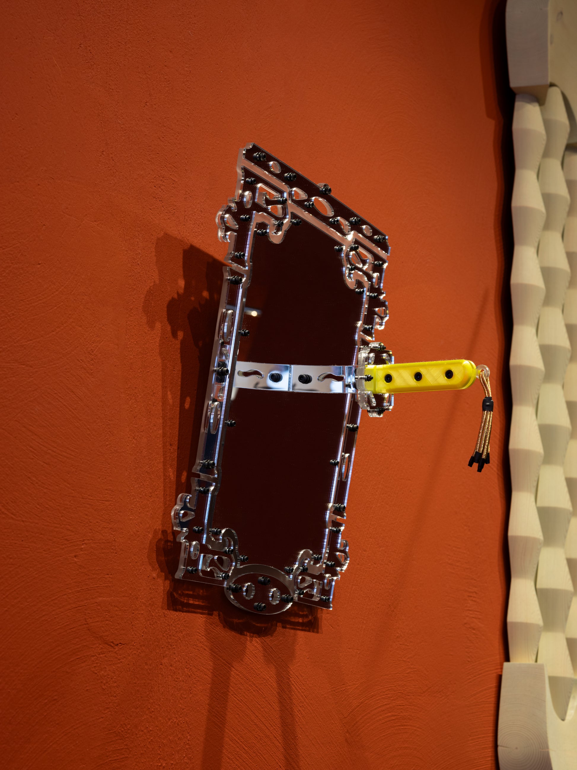 “I’ve been working with laser cut acrylic for quite some time now. A bit more recently I started making swords. Samurai swords are my favourite to make, and a short sword like the one that has pierced the surface of the mirror is called Tantō